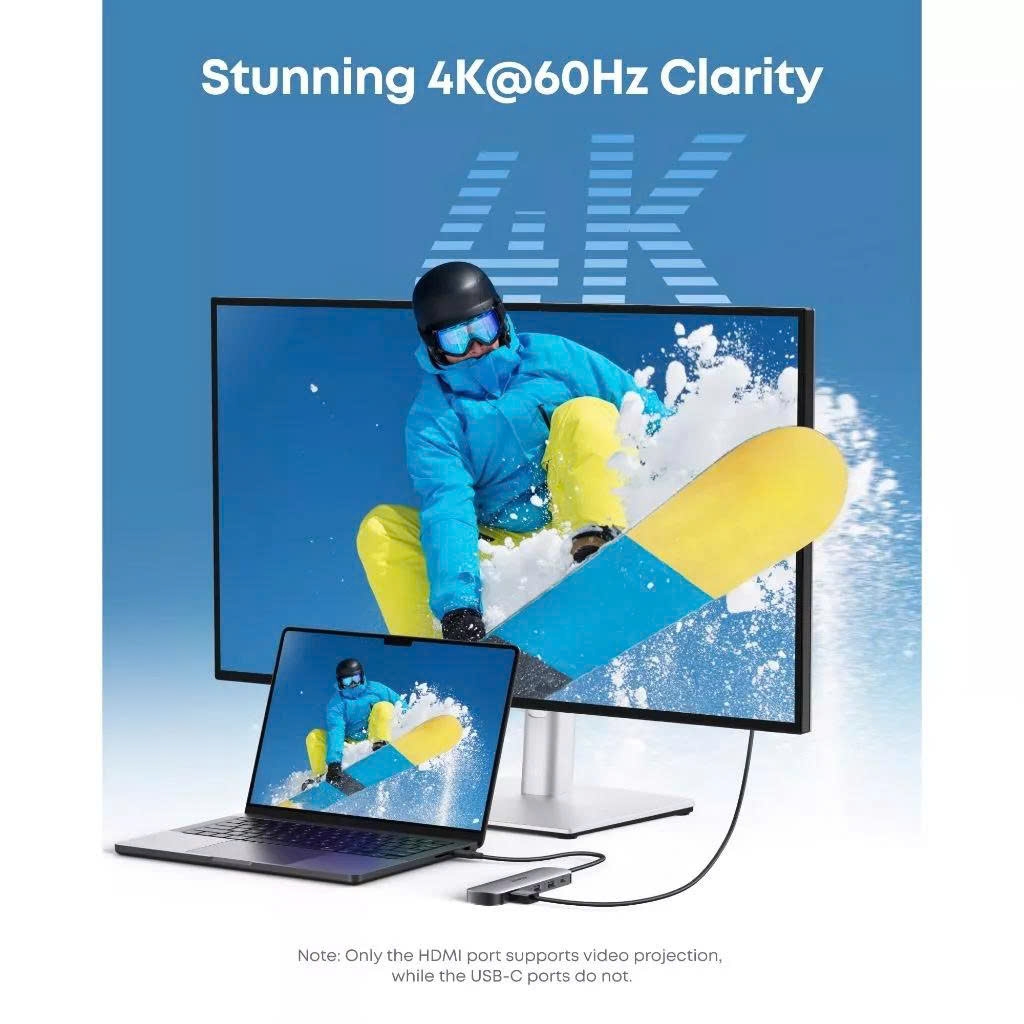 Tích hợp đủ 7 cổng cần thiết cho laptop: HDMI 4K@60Hz, USB-C và USB-A 3.0 tốc độ 5Gbps, USB-C PD-In 100W cùng khe SD/TF 3.0. Thiết kế tinh gọn, cắm-là-dùng, tối ưu cho học tập, làm việc và sáng tạo đa màn hình.