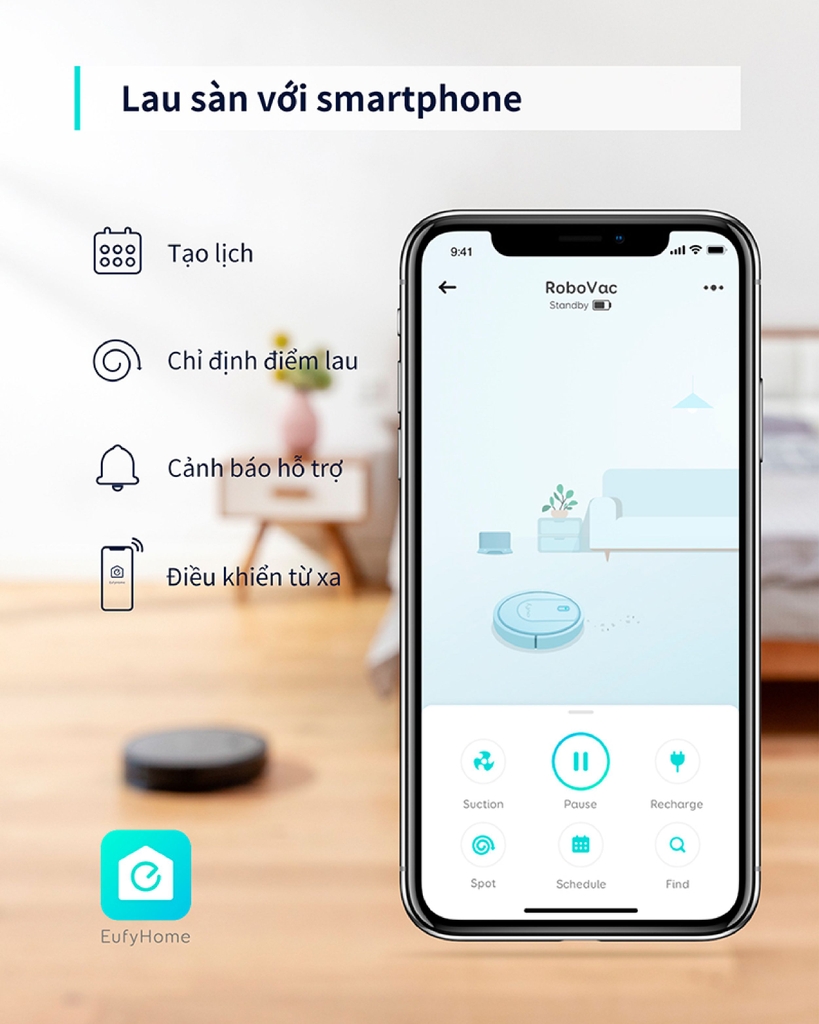 RoboVac tự động quay trở lại đế sạc để sạc pin sau đó quay trở về nơi nó dừng lại và tiếp tục làm sạch các khu vực còn lại.