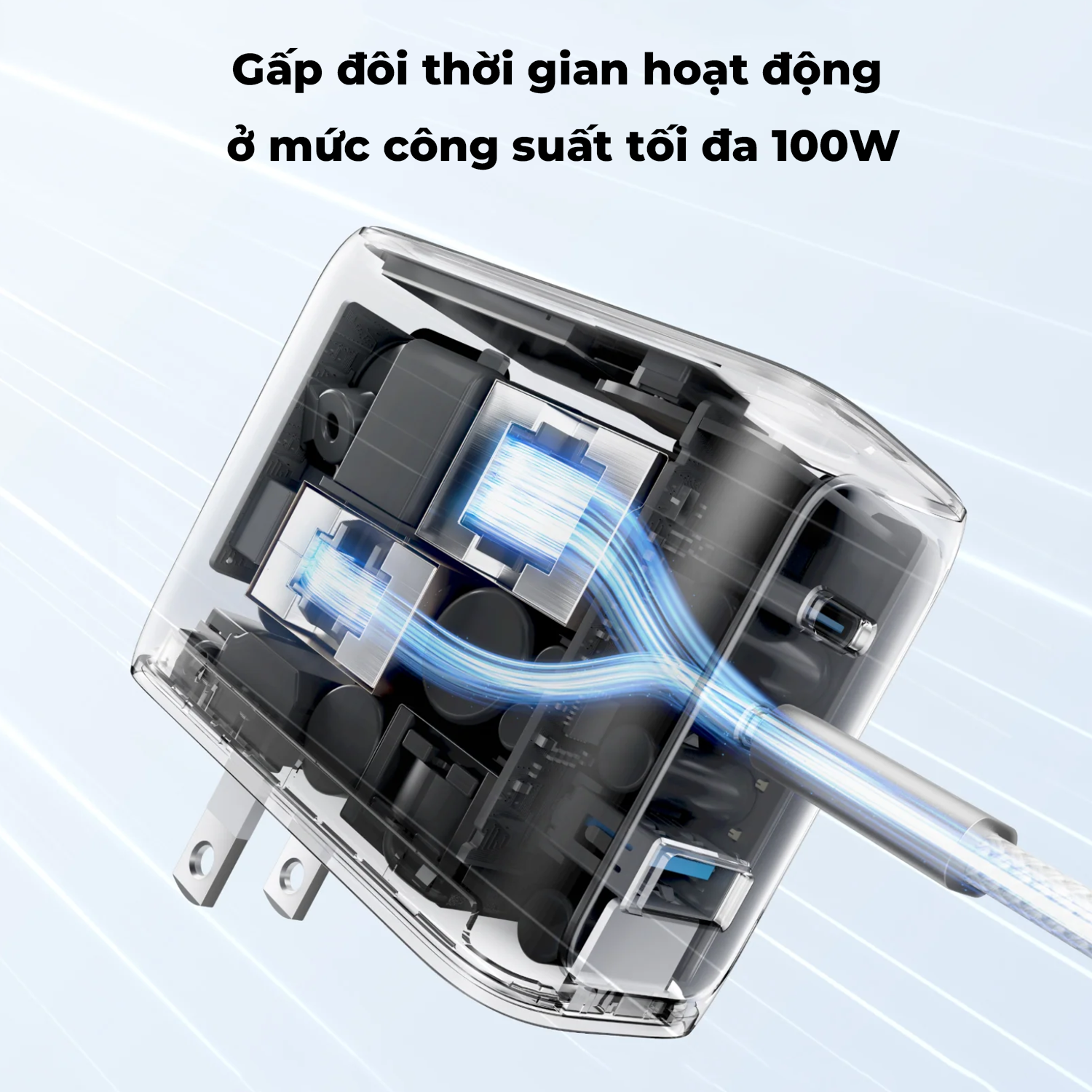 Công nghệ GaN tiên tiến mang đến đầu ra 100W ổn định trên bất kỳ cổng USB-C nào. Thiết bị có khả năng duy trì hiệu suất đỉnh cao lâu gấp đôi so với các bộ sạc 100W thông thường trên thị trường.