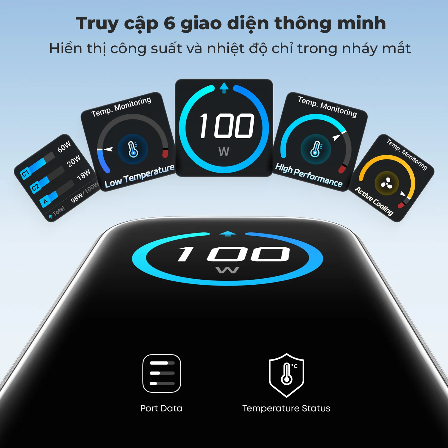 Màn hình thông minh độ phân giải cao hiển thị chi tiết trạng thái sạc, nhiệt độ và hiệu suất cổng theo thời gian thực, giúp bạn dễ dàng theo dõi và kiểm soát tức thì.