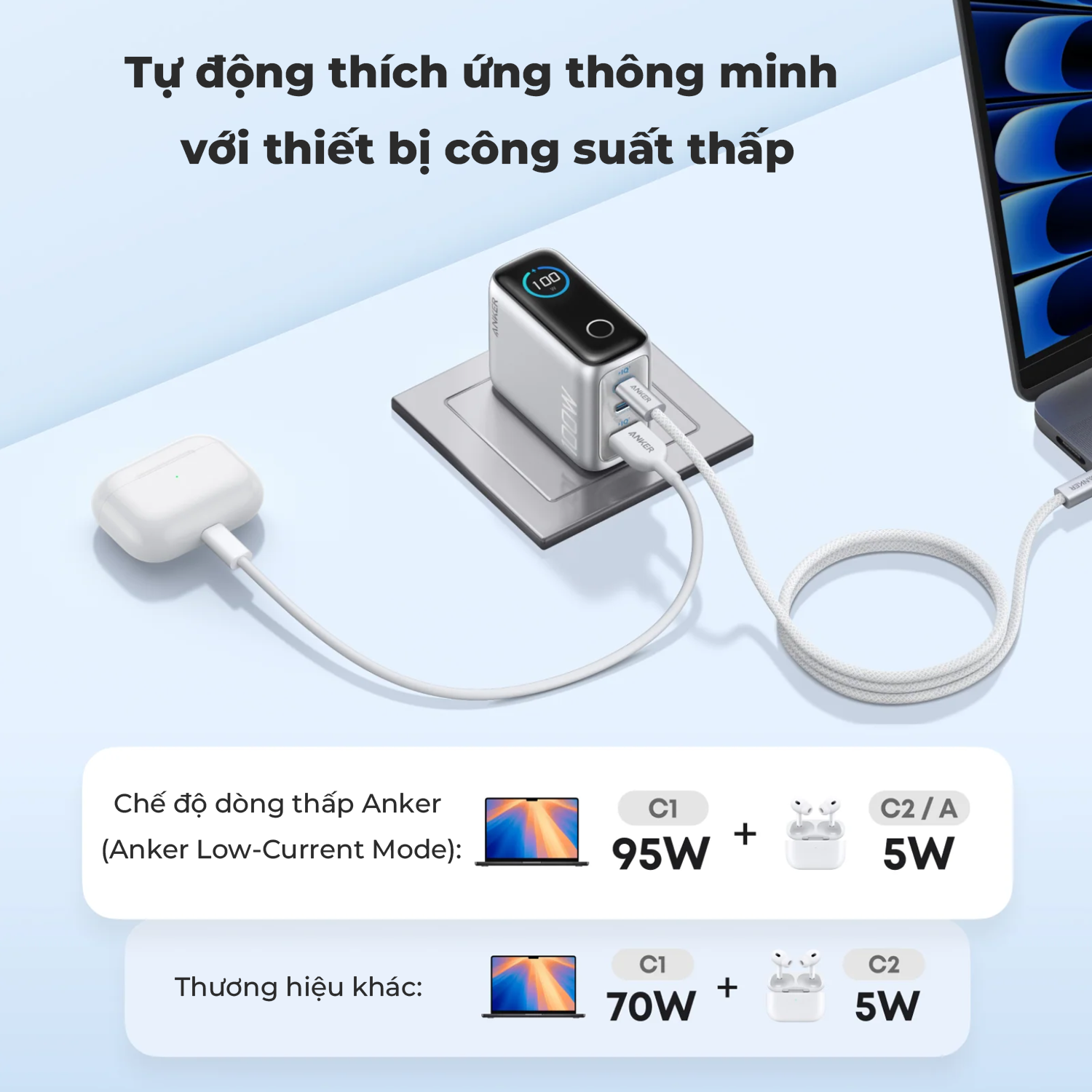 Cổng USB-C2 hoặc USB-A sẽ tự động chuyển sang Chế độ dòng điện thấp (95W + 5W) khi công suất đầu ra duy trì ở mức bằng hoặc dưới 5W trong vòng 1 phút. Cơ chế này giúp sạc an toàn cho tai nghe và các thiết bị tiêu thụ điện năng thấp khác.