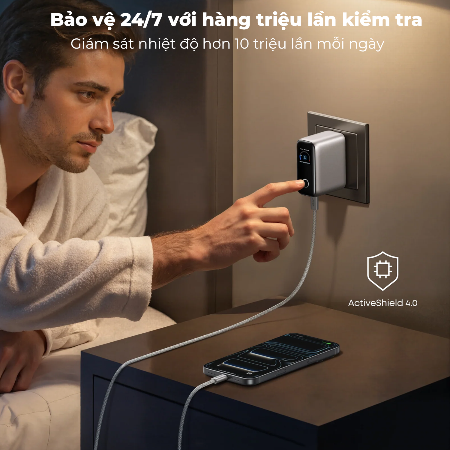 Hệ thống ActiveShield 4.0 liên tục giám sát nhiệt độ hơn 10 triệu lần mỗi ngày, tự động điều chỉnh công suất để duy trì trạng thái sạc an toàn và ổn định. Mang lại sự yên tâm tuyệt đối khi sạc thiết bị suốt ngày dài hoặc qua đêm.