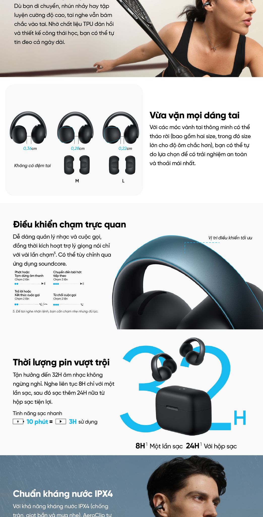 • Kháng nước chuẩn IPX4 (chống tràn, giọt bắn và mưa nhẹ), AeroClip tự tin đồng hành cùng bạn trong mọi hoạt động.